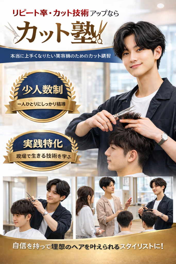 感覚に頼らない、再現性のあるカット技術、接客術を学ぶ実践型カット塾。