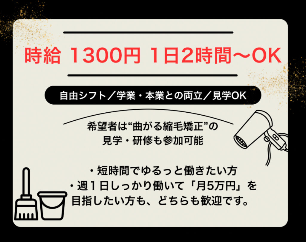 | 【待遇】 交通費支給(上限あり) 制服・エプロン貸与 髪型・髪色・ピアス自由(サロン基準内) 曲がる縮毛矯正の研修・見学OK スタッフ割引あり |